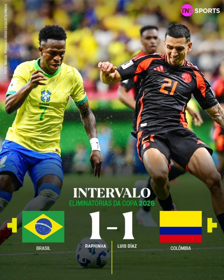 2025-03-21 10:16:44半场-拉菲尼亚点射维尼修斯造点迪亚斯扳平 巴西1-1哥伦比亚