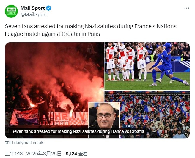 2025-03-25 17:36:40邮报:7名球迷因在法国vs克罗地亚比赛中行纳粹礼,被警方拘留