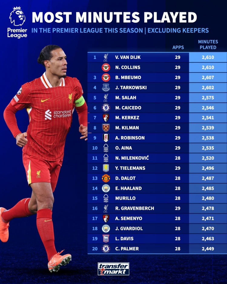 2025-03-27 03:24:50英超外场球员出场榜:范迪克打满29场居首,萨拉赫第5、凯塞多第6