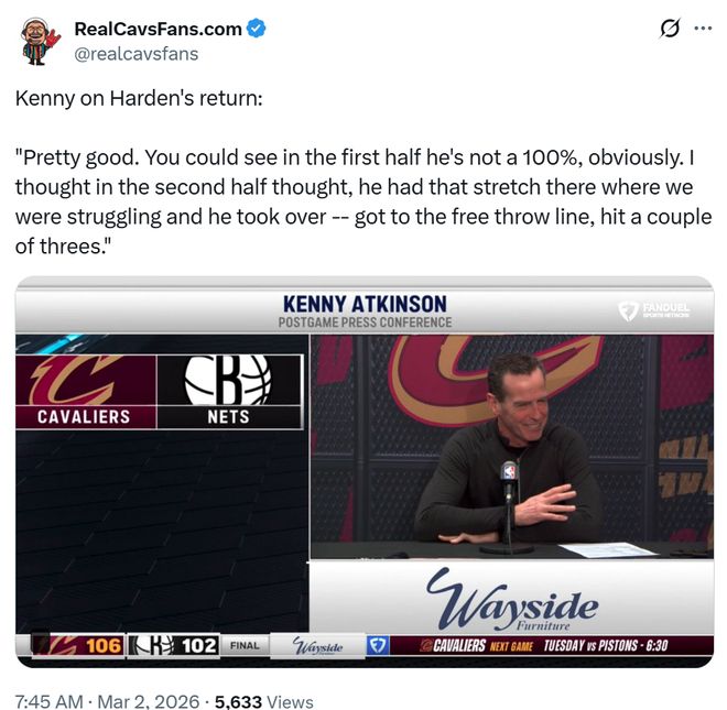 同时本场结束后,哈登加盟骑士至今出战8场比赛,已经拿到至少150分50助,创造队史控卫最快纪录,带领骑士拿下7胜1负战绩。